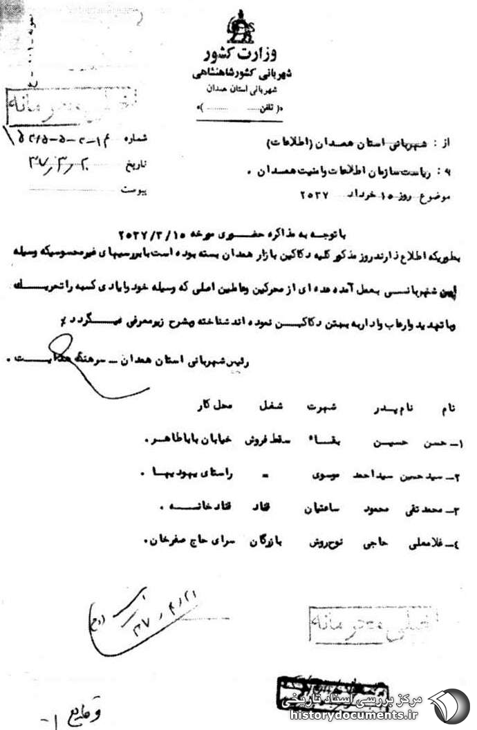 به طوری که اطلاع دارند روز مذکور کلیه دکاکین بازار همدان بسته بوده است با بررسیهای غیر محسوسی که وسیله این شهربانی به عمل آمده عدهای از محرکین و عاملین اصلی که وسیله خود و ایادی کسبه را تحریک و با تهدید و ارعاب وادار به بستن دکاکین نمودهاند شناخته و به شرح زیر معرفی میگردد