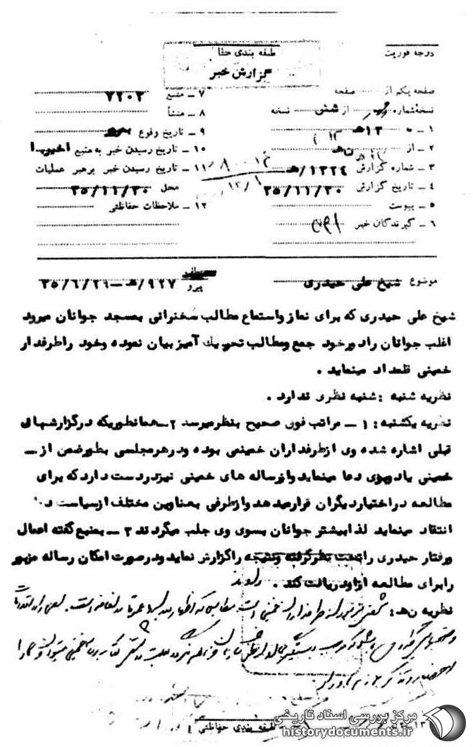 شیخ علی حیدری که برای نماز و استماع مطالب سخنرانی به مسجد جوانان میرود اغلب جوانان را دور خود جمع و مطالب تحریکآمیز بیان نموده و خود را طرفدار خمینی قلمداد مینماید.
