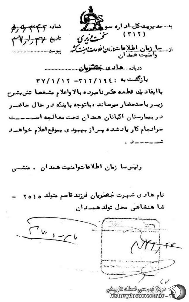با ایفاد یک قطعه عکس نامبرده بالا و اعلام مشخصاتش به شرح زیر به استحضار میرساند، با توجه به اینکه در حال حاضر در بیمارستان اکباتان همدان تحت معالجه است سرانجام کار یاد شده پس از بهبودی به موقع اعلام خواهد شد.