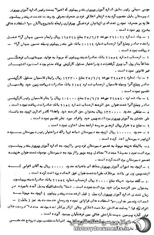 10ـ گفته میشود هر ماه مبلغ 20000 ریال از حساب شماره 21554 بانک صادرات بندر پهلوی بهعنوان حقالزحمه برای خود برداشت نموده است. ضمناً با تحقیقاتی که به عمل آمده نامبرده در زمان تصدی اداره آموزش و پرورش اردبیل (قبل از خدمت در بندر پهلوی) از بودجه مربوط به احداث و تعمیر مدارس سوءاستفادههای فراوانی نموده و در محل خدمت جدید نیز (بابل) ـ افرادی که قبلاً به علت نداشتن صلاحیت اخلاقی و مالی از کار برکنار شده بودند مجدداً در سمتهای قبلی گمارده و به همین جهت ناراحتیهایی بین فرهنگیان بوجود آورده است.