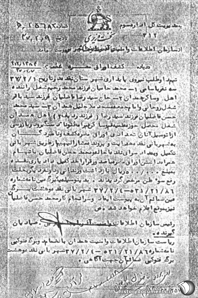 ریاست سازمان اطلاعات و امنیت همدان بانضمام دو برگ فتوکپی نامه شماره 86 /21 /531 – 4 /2 /37 شهربانی نقده و هشت برگ فتوکپی ضمائم آن جهت اگاهی.