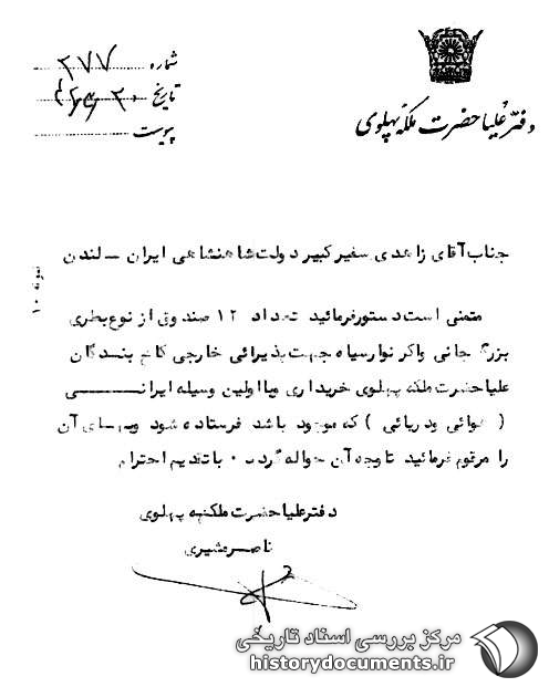متمنی است دستور فرمایید تعداد 12 صندوق از نوع بطری بزرگ جانی واکر نوار سیاه جهت پذیرایی خارجی کاخ بندگان علیاحضرت ملکه پهلوی خریداری و با اولین وسیله ایرانی (هوایی و دریایی) که موجود باشد فرستاده شود و بهای آن را مرقوم فرمایید تا وجه آن حواله گردد. با تقدیم احترام