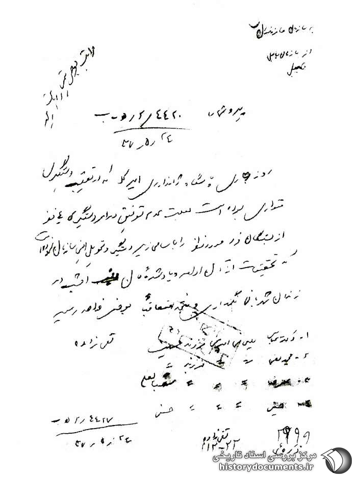 روز جاری پاسگاه ژاندارمری امیرکلا که در تعقیب دستگیری متواری بوده است به علّت عدم توفیق در امر دستگیری 4 نفر از بستگان فرد مورد نظر را به اسامی زیر دستگیر و تحویل این سازمان نمودهاست که تحقیقات از آن ادامه و یادشدگان امشب در زندان شهربانی نگهداری و نتیجه متعاقباً به عرض خواهد رسید.