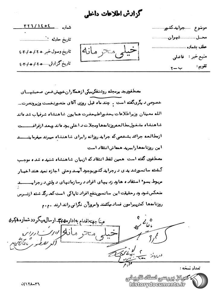مصطفوی مدیر مجله روشنفکر به یکی از همکاران خویش ضمن صحبتهای خصوصی دیگری گفته است: چند ماه قبل، روزی آقای منصور نخستوزیر و نصرتالله معینیان وزیر اطلاعات به حضور اعلیحضرت همایون شاهنشاه شرفیاب شدهاند، شاهنشاه مشغول مطالعه روزنامهها و مجلات داخلی بودهاند و بعد از فراغت از مطالعه جراید به شخصی که جراید روزانه را برای شاهنشاه میبرند میفرمایند این روزنامهها را ببرید همهاش انتقاد است.