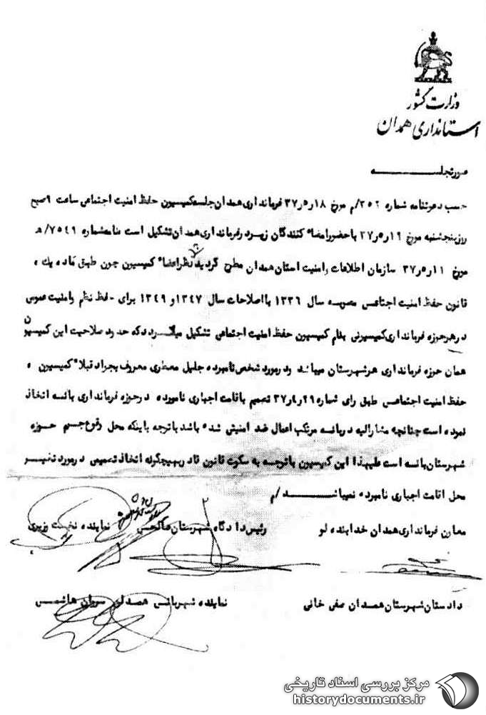حسب دعوتنامه شماره ۳۵۲/ م مورخ 18 /5 /37 فرمانداری همدان جلسه کمیسیون حفظ امنیت اجتماعی ساعت ۹ صبح روز پنجشنبه مورخ 19 /5 /37 با حضور امضاء کنندگان زیر در فرمانداری همدان تشکیل است، نامه شماره ۷۵4۹/ ه مورخ 11 /5 /37 سازمان اطلاعات و امنیت استان همدان مطرح گردیده به نظر امضاء کمیسیون چون طبق ماده یک قانون حفظ امنیت اجتماعی مصوبه سال ۱۳۲6 با اصلاحات سال ۱۳4۷ و ۱۳4۹ برای حفظ نظم و امنیت عمومی در هر حوزه فرمانداری کمیسیونی بنام کمیسیون حفظ امنیت اجتماعی تشکیل میگردد که حدود صلاحیت این کمیسیون همان حوزه فرمانداری هر شهرستان میباشد و در مورد شخص نامبرده جلیل معطری معروف به جواد قبلاً کمیسیون، حفظ امنیت اجتماعی طبق رای شماره 29 /4 /37 تصمیم به اقامت اجباری نامبرده در حوزه فرمانداری بانه اتخاذ نموده است چنانچه مشارالیه در بانه مرتکب اعمال ضد امنیتی شده باشد با توجه به اینکه محل وقوع جرم حوزه شهرستان بانه است علیهذا این کمیسیون با توجه به سکوت قانون قادر بهه هیچ گونه اتخاذ تصمیمی در مورد تغییر محل اقامت اجباری نامبرده نمیباشد / م