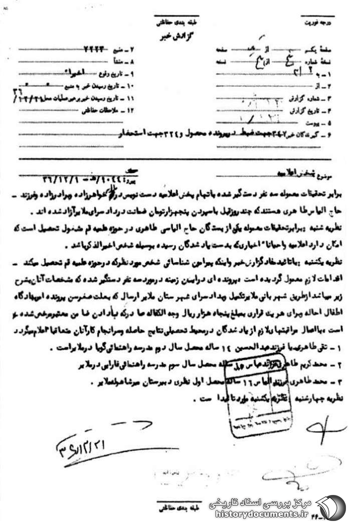 برابر تحقیقات معموله سه نفر دستگیر شده به اتهام پخش اعلامیه دست نویس در ملایر خواهرزاده و برادرزاده و فرزند حاج الیاس طاهری هستند که چند روز قبل با سپردن پنج هزار تومان ضمانت در دادسرای ملایر آزاد شدهاند.