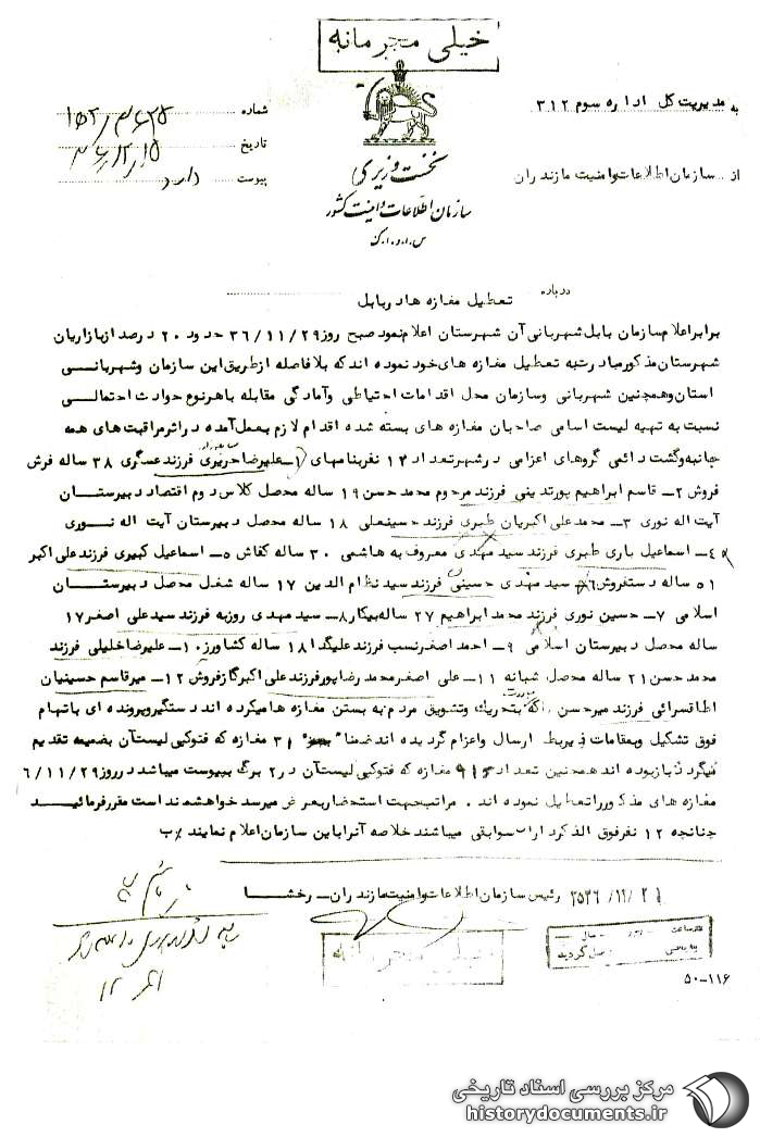برابر اعلام سازمان بابل، شهربانی آن شهرستان اعلام نمود صبح روز 29 /11 /36 حدود 20 درصد از بازاریان شهرستان مذکور مبادرت به تعطیل مغازههای خود نمودهاند که بلافاصله از طریق این سازمان و شهربانی استان و همچنین شهربانی و سازمان محل اقدامات احتیاطی و آمادگی مقابله با هر نوع حوادث احتمالی نسبت به تهیه لیست اسامی صاحبان مغازههای بسته شده اقدام لازم به عمل آمده در اثر مراقبتهای همه جانبه و گشت دائمی گروههای اعزامی در شهر تعداد 12 نفر به نامهای: 1- علیرضا حریری فرزند عسگری 38 ساله فرشفروش 2- قاسم ابراهیمپور تدینی1 فرزند مرحوم محمدحسن 19 ساله محصّل کلاس دوم اقتصاد دبیرستان آیتالله نوری 3- محمدعلی اکبریان طبری2 فرزند حسنیعلی 18 ساله محصّل دبیرستان آیتالله نوری 4- اسماعیل باری طبری فرزند سیدمهدی معروف به هاشمی 30 ساله کفّاش 5- اسماعیل کبیری3 فرزند علیاکبر 51 ساله دست فروش 6- سیدمهدی حسینی4 فرزند سیدنظامالدین 17 ساله شغل محصّل دبیرستان اسلامی 7- حسین نوری5 فرزند محمد ابراهیم 27 ساله بیکار 8- سیدمهدی روزبه فرزند سیدعلیاصغر 17 ساله محصّل دبیرستان اسلامی 9- احمد اصغرنسب6 فرزند علی گدا 18 ساله کشاورز 10- علیرضا خلیلی7 فرزند محمدحسن 21 ساله محصّل شبانه 11- علیاصغر محمدرضاپور8 فرزند علی اکبر گازفروش 12- میرقاسم حسینیان اطاقسرایی9 فرزند میرحسن را که مبادرت به تحریک و تشویق مردم به بستن مغازهها میکردهاند دستگیر و پروندهای به اتهام فوق تشکیل و به مقامات ذیربط ارسال و اعزام گردیدهاند ضمناً 31 مغازه که فتوکپی لیست آن به ضمیمه تقدیم میگردد باز بودهاند همچنین تعداد 91 مغازه که فتوکپی لیست آن در 2 برگ به پیوست میباشد در روز 29 /11 /36 مغازههای مذکور را تعطیل نمودهاند. مراتب جهت استحضار به عرض میرسد خواهشمند است مقرر فرمایید چنانچه 12 نفر فوقالذکر دارای سوابقی میباشند خلاصه آن را به این سازمان اعلام نمایند.10 رئیس سازمان اطلاعات و امنیت مازندران رخشا
