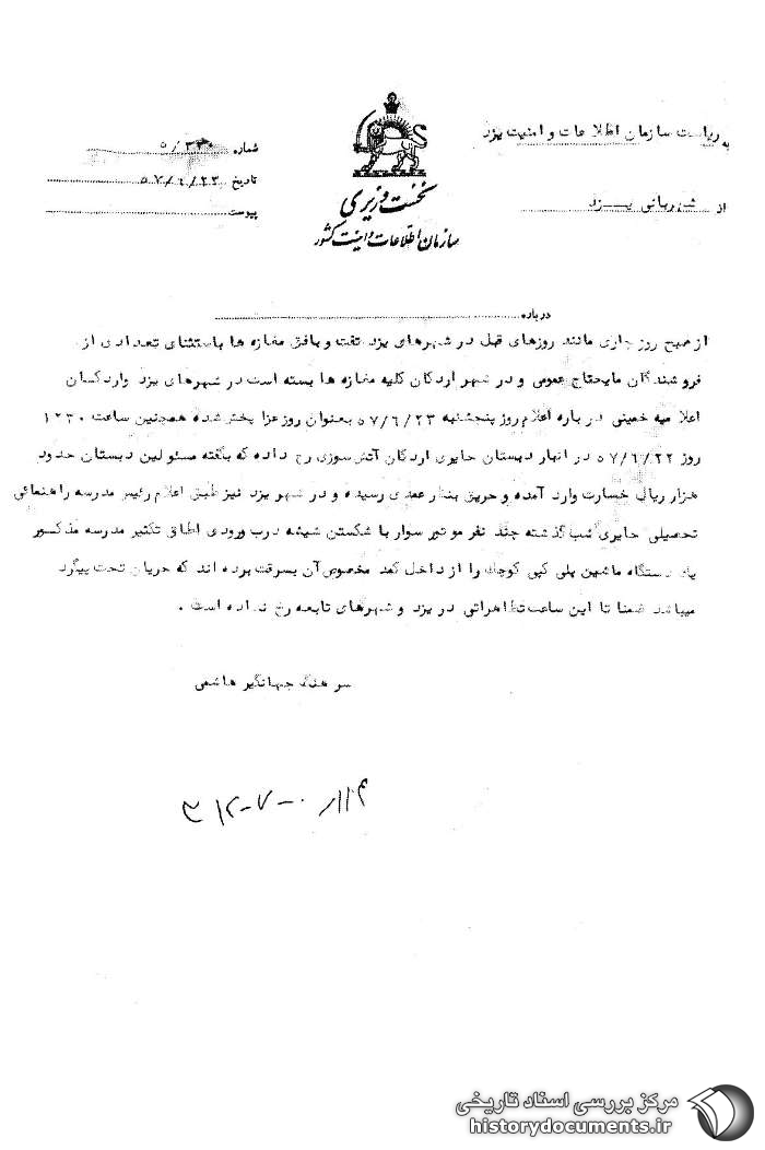 از صبح روز جاری مانند روزهای قبل در شهرهای یزد، تفت و بافق مغازهها به استثنای تعدادی از فروشندگان مایحتاج عمومی و در شهر اردکان کلیه مغازهها بسته است. در شهرهای یزد و اردکان اعلامیه خمینی درباره اعلام روز پنجشنبه 23 /6 /57 به عنوان روز عزا پخش شده، همچنین ساعت 1230 روز 22 /6 /57 در انبار دبستان حایری اردکان آتشسوزی رخ داده که به گفته مسئولین دبستان حدود هزار ریال خسارت وارد آمده و حریق به نظر عمدی رسیده و در شهر یزد نیز طبق اعلام رئیس مدرسه راهنمائی تحصیلی حایری شب گذشته چند نفر موتورسوار با شکستن شیشه درب ورودی اطاق تکثیر مدرسه مذکور یک دستگاه ماشین پلی کپی کوچک را از داخل کمد مخصوص آن به سرقت بردهاند که جریان تحت پیگرد میباشد. ضمناً تا این ساعت تظاهراتی در یزد و شهرهای تابعه رخ نداده است.