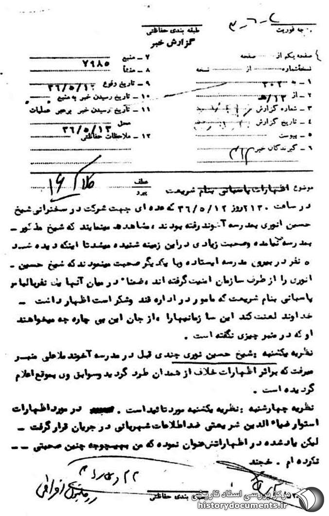 در ساعت ۲۱:۳۰ روز 12 /5 /36 که عدهای جهت شرکت در سخنرانی شیخ حسین انوری به مدرسه آخوند رفته بودند، مشاهده مینمایند که شیخ مذکور به مدرسه نیامده و صحبت زیادی در این زمینه شنیده میشد تا اینکه دیده شد ۵ نفر در بیرون مدرسه ایستاده و با یکدیگر صحبت مینمودند که شیخ حسین انوری را از طرف سازمان امنیت گرفتهاند، ضمناً در میان آنها یک نفر با لباس پاسبانی به نام شریعت که مأمور در اداره قند و شکر است اظهار داشت خداوند لعنت کند این سازمانیها را، از جان این بیچاره چه میخواهند او که در منبر چیزی نگفته است.