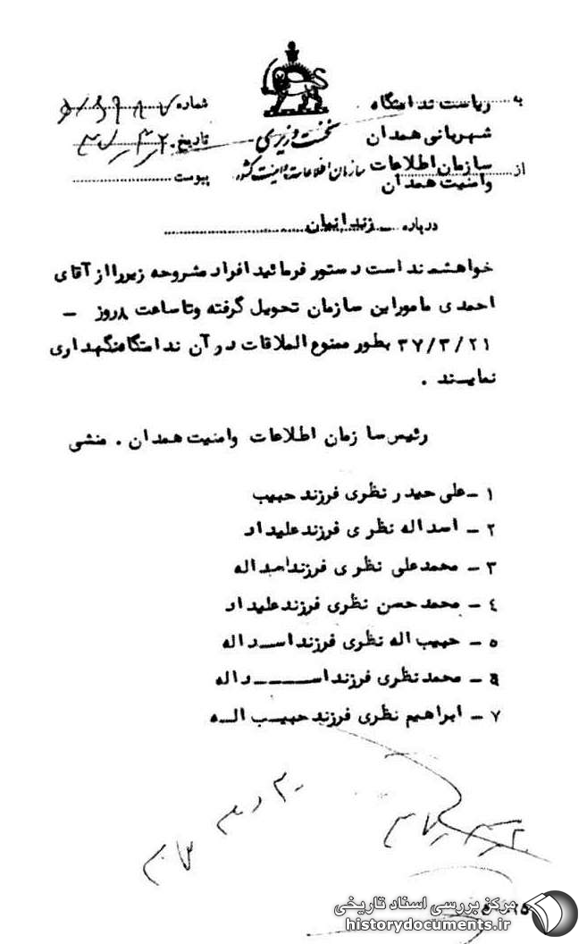 خواهشمند است دستور فرمائید افراد مشروحه زیر را از آقای احمدی مأمور این سازمان تحویل گرفته و تا ساعت ۸ روز 21 /3 /37 به طور ممنوعالملاقات در آن ندامتگاه نگهداری نمایند.