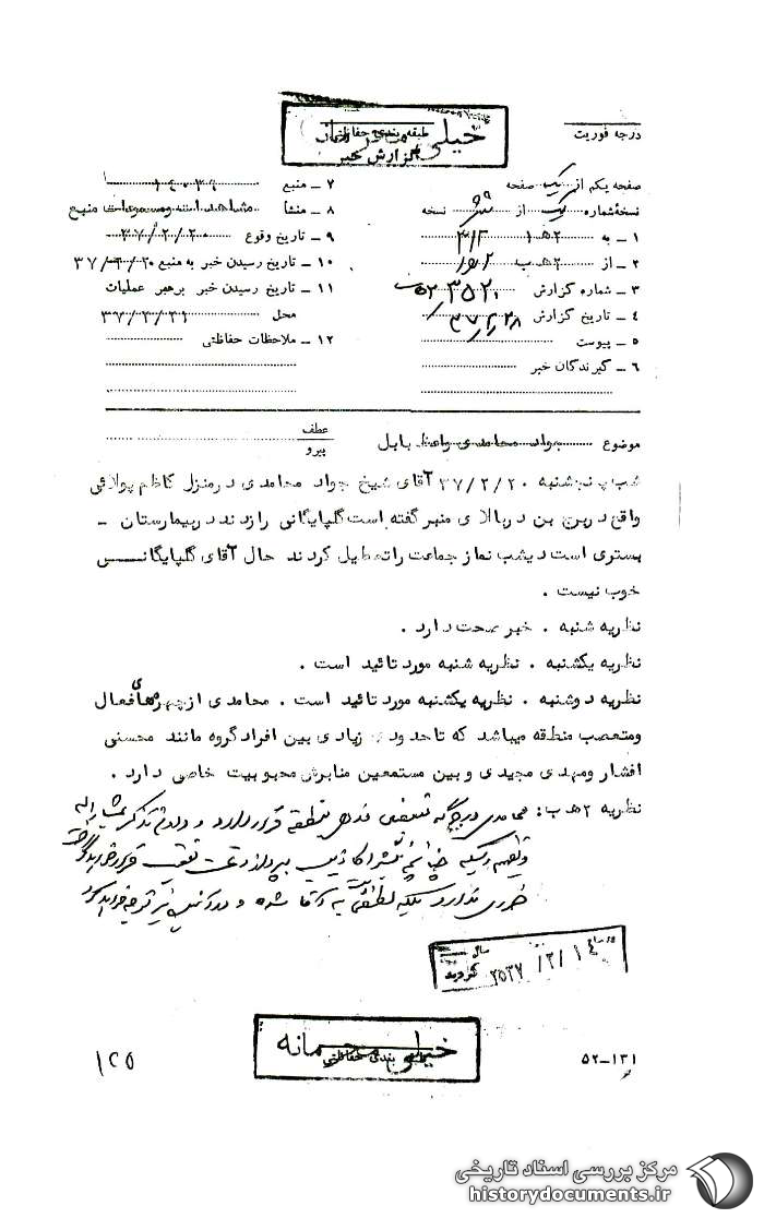 1. اداره کل سوم پس از دریافت این گزارش طی نامه شماره : 4915 /312 - 2 /5 /37 نوشت: «نامبرده بالا فاقد سابقه بایگانی شده در این اداره کل میباشد. خواهشمند است دستور فرمائید ضمن تهیه و ارسال مشخصات کامل و یک قطعه عکس یادشده، اعمال و رفتار وی را توسط منابع و همکاران تحت مراقبت قرار داده و نتیجه را با هرگونه سوابقی که از مشارالیه در آن سازمان موجود است به این اداره کل ارسال دارند... ثابتی»