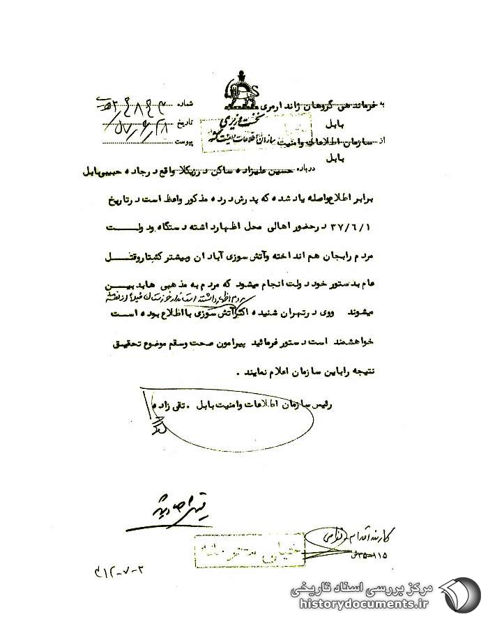 برابر اطلاع واصله یادشده که پدرش در ده مذکور واعظ است در تاریخ 1 /6 / 37 در حضور اهالی محل اظهار داشت دستگاه و دولت مردم را به جان هم انداخته و آتشسوزی آبادان و بیشتر کشتار و قتلعام به دستور خود دولت آنجام میشود که مردم به مذهبیها بدبین میشوند و وی در تهران شنیده اکثر مردم اظهار داشتند استاندار خوزستان قبلاً از نقشه آتشسوزی بااطلاع بوده است. خواهشمند است دستور فرمائید پیرامون صحت و یا سقم موضوع تحقیق نتیجه را به این سازمان اعلام نمایند.