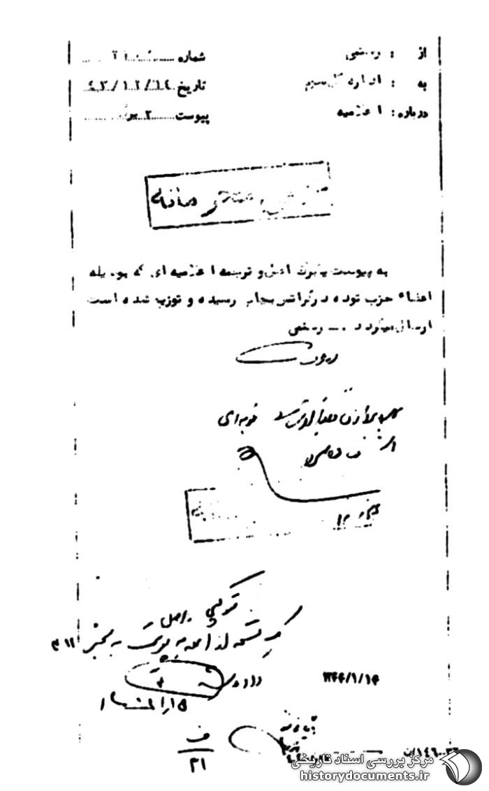 به پیوست یک برگ اصل و ترجمه اعلامیه ای که به وسیله اعضاء حزب توده