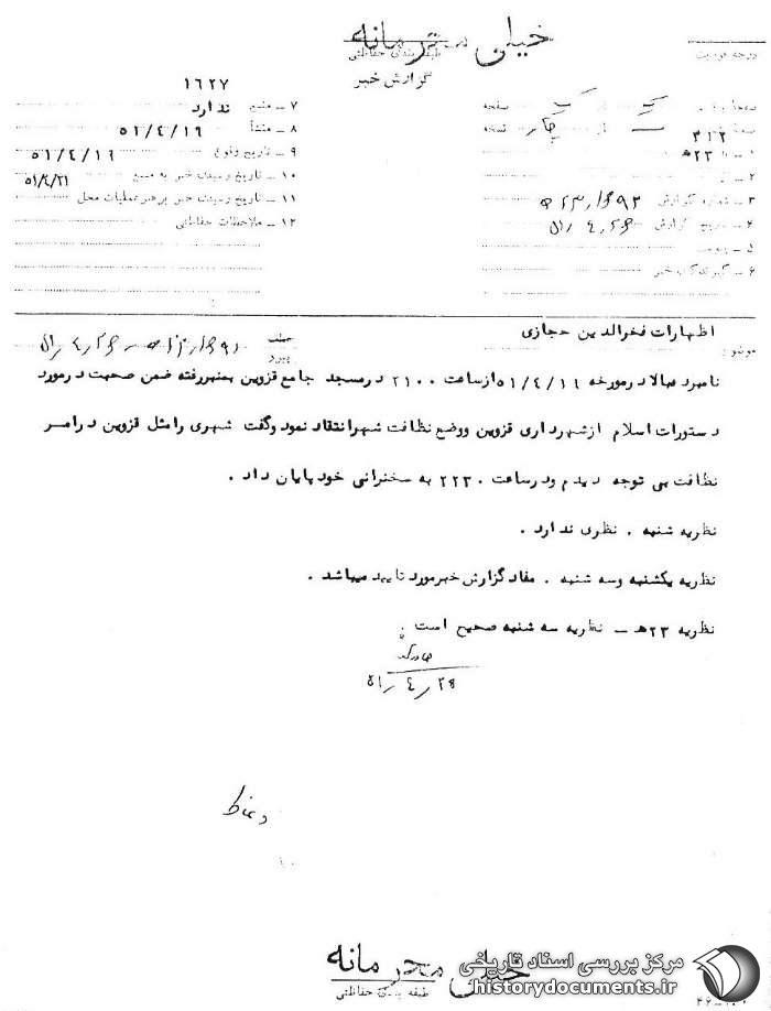 نامبرده بالا در مورخه11 /4 /51 از ساعت21 در مسجد جامع قزوین به منبر رفته ضمن صحبت در مورد دستورات اسلام از شهرداری قزوین و وضع نظافت شهر انتقاد نمود و گفت شهری را مثل قزوین در امر نظافت بیتوجه دیدم و در ساعت 22.30 به سخنرانی خود پایان داد.