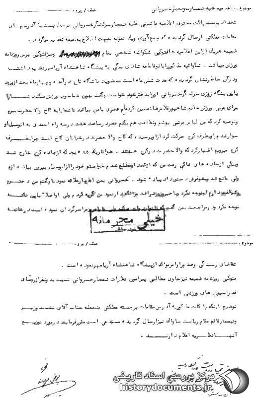 فتوکپى روزنامه ضمیمه نیز حاوى مطالبى پیرامون نظرات تیمسار خسروانى نسبت به دو نفر از رؤساى فدراسیونهاى ورزشى است. توضیح اینکه پاکات مذکور به آدرس مقامات برجسته مملکتى منجمله جناب آقاى نخستوزیر و تیمسار قائممقام ریاست ساواک نیز ارسال گردیده مستدعى است مقرر فرمایند در مورد توزیع آنها نظریه اعلام دارند. محترما به عرض مىرسد.