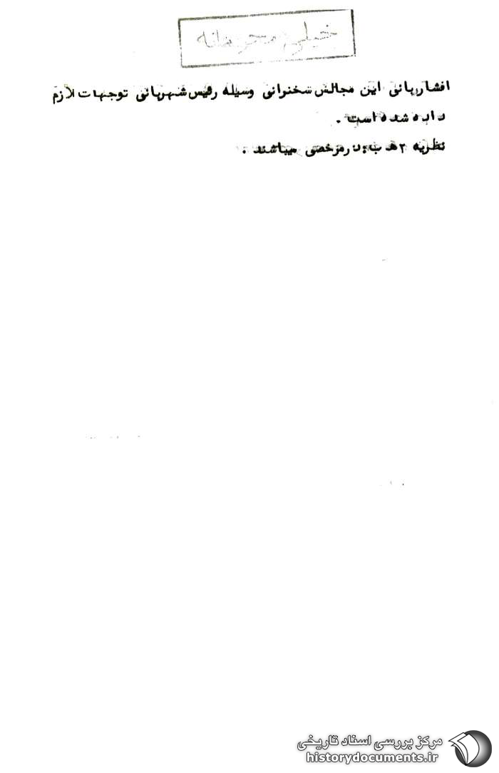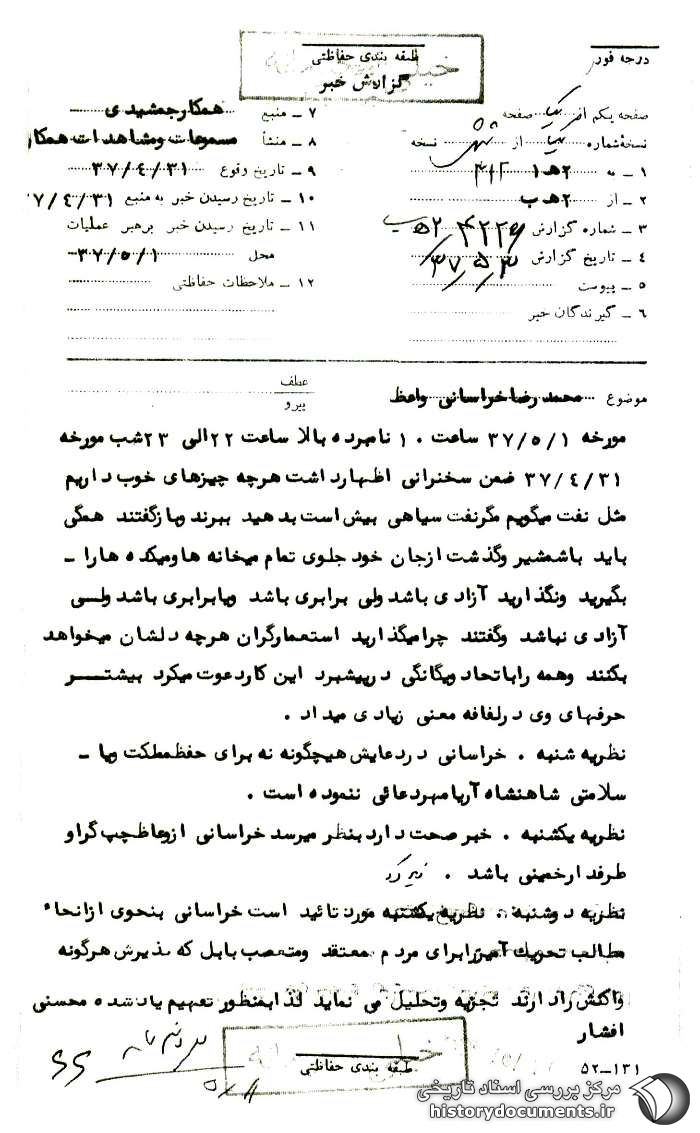 مورخه 1 /5 /37 ساعت 10 نامبرده بالا ساعت 22 الی 23 شب مورخه 31 /4 /37 ضمن سخنرانی اظهار داشت هرچه چیزهای خوب داریم مثل نفت، میگویم مگر نفت سیاهی بیش است بدهید ببرند و باز گفتند همگی باید با شمشیر و گذشت از جان خود جلوی تمام میخانهها و میکدهها را بگیرید و نگذارید آزادی باشد ولی برابری باشد و یا برابری باشد ولی آزادی نباشد و گفتند چرا میگذارید استعمارگران هرچه دلشان میخواهد بکنند و همه را به اتحاد و یگانگی در پیشبرد این کار دعوت میکرد. بیشتر حرفهای وی در لفافه معنی زیادی میداد.1
