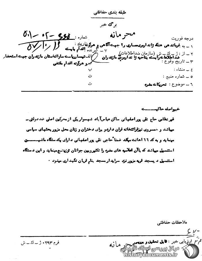 غیر نظامی حاج نقی پوراصفهانی ساکن عباس آباد شهسوار یکی از محرکین اصلی ضد دولتی میباشد و همسر وی نیز قرائتخانه قرآن دارد برای دختران و زنان محل مزبور بحثهای سیاسی مینماید و به کد 66 اهانت میکند ضمناً حاجی نقی پوراصفهانی دارای یک دستگاه ماشین استنسیل میباشد که با آن اعلامیههای مضره را تکثیر و بین جوانان توزیع مینماید و این دستگاه استنسیل در مسجد قریه مزبور نزد سرایدار مسجد به نام قربان نگهداری میشود.