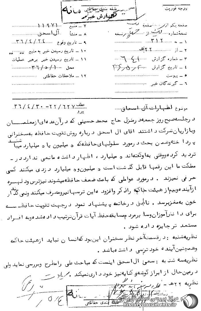 در جلسه صبح روز جمعه در منزل حاج محمد حسینی که در آن عدهای از معلمان و بازاریان شرکت داشتند آقای آل اسحاق درباره روش تقویت حافظه به سخنرانی پرداخته و ضمن بحث در مورد سلولهای حافظه که 5 میلیون یا 5 میلیارد میباشند تردید کرده و وقتی به او گفتهاند 5 میلیارد، اظهار داشته مانعی ندارد در مملکت ما این رقمها قابل گذشت است 5 میلیون و 5 میلیارد دزدی میکنند کسی حرفی نمیزند.