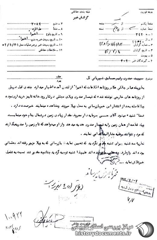 بهطوری که عباس جلالی، عکاس روزنامه اطلاعات که اخیراً از لندن آمده، اظهار میدارد: چندی قبل در یکی از روزنامههای خارجی نوشته شده که تیمسار صدری، ویلای مجللی در کنار رودخانه تایمز خریداری نموده و بلافاصله بعد از انتشار این خبر بازرسانی به محل ویلا میروند و مشاهده مینمایند خبر صحت دارد.