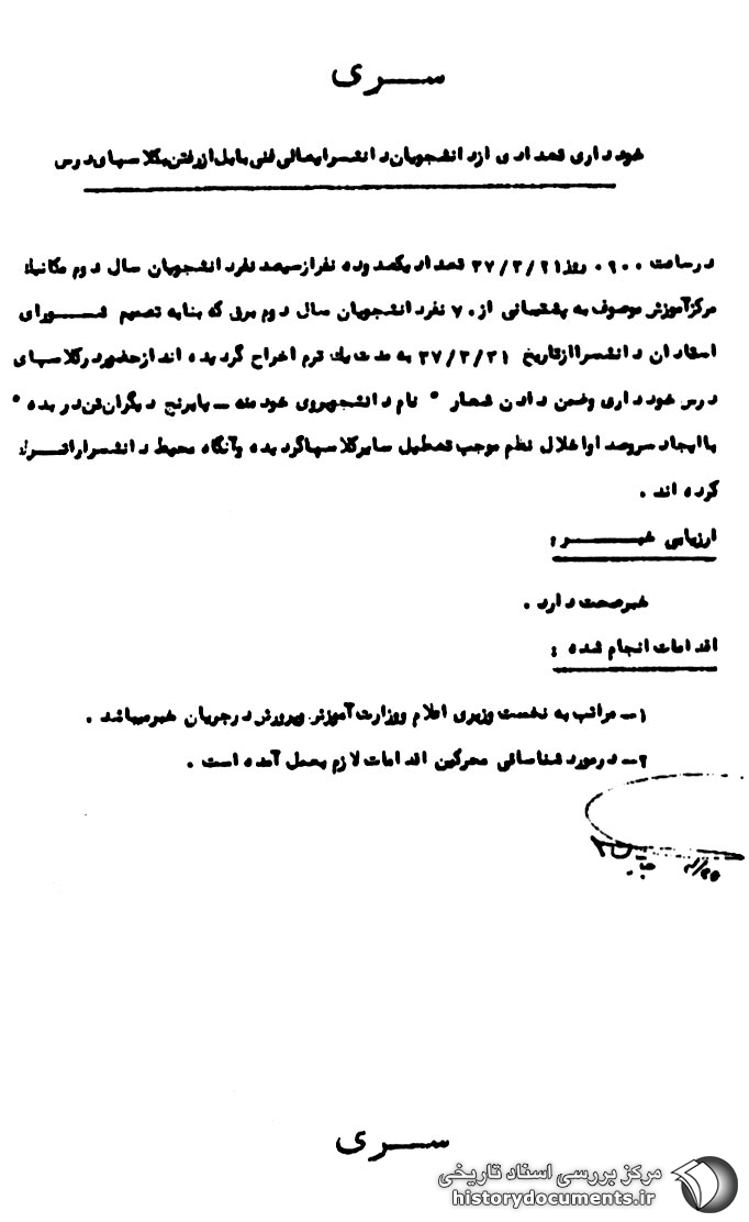 در ساعت 0900 روز 21 / 3 / 37 تعداد یکصد و ده نفر از سیصد نفر دانشجویان سال دوم مکانیک مرکز آموزش موصوف به پشتیبانی از 70 نفر دانشجویان سال دوم برق که بنا به تصمیم شورای استادان دانشسرا از تاریخ 31 /3 / 37 به مدت یک ترم اخراج گردیدهاند از حضور در کلاسهای درس خودداری و ضمن دادن شعار «نام دانشجو به روی خود منه – یا به رنج دیگران تن در بده» با ایجاد سرو صدا و اخلال نظم موجب تعطیل سایر کلاسها گردیده و آنگاه محیط دانشسرا را ترک کردهاند.