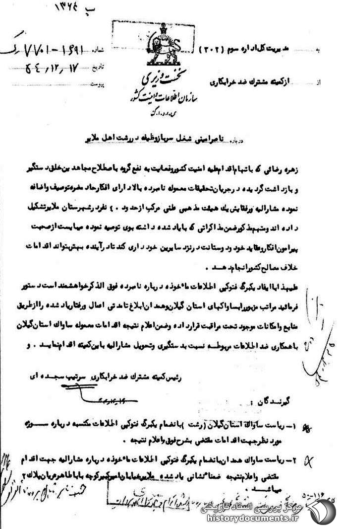 علیهذا با ایفاد یک برگ فتوکپی اطلاعات ماخوذه درباره نامبرده فوقالذکر خواهشمند است دستور فرمایید مراتب مزبور را به ساواکهای استان گیلان و همدان ابلاغ تا مدتی اعمال و رفتار یاد شده را از طریق منابع و امکانات موجود تحت مراقبت قرار داده و ضمن اعلام نتیجه اقدامات معموله ساواک استان گیلان با همکاری ضد اطلاعات مربوطه نسبت به دستگیری و تحویل مشارالیه به این کمیته اقدام نماید.