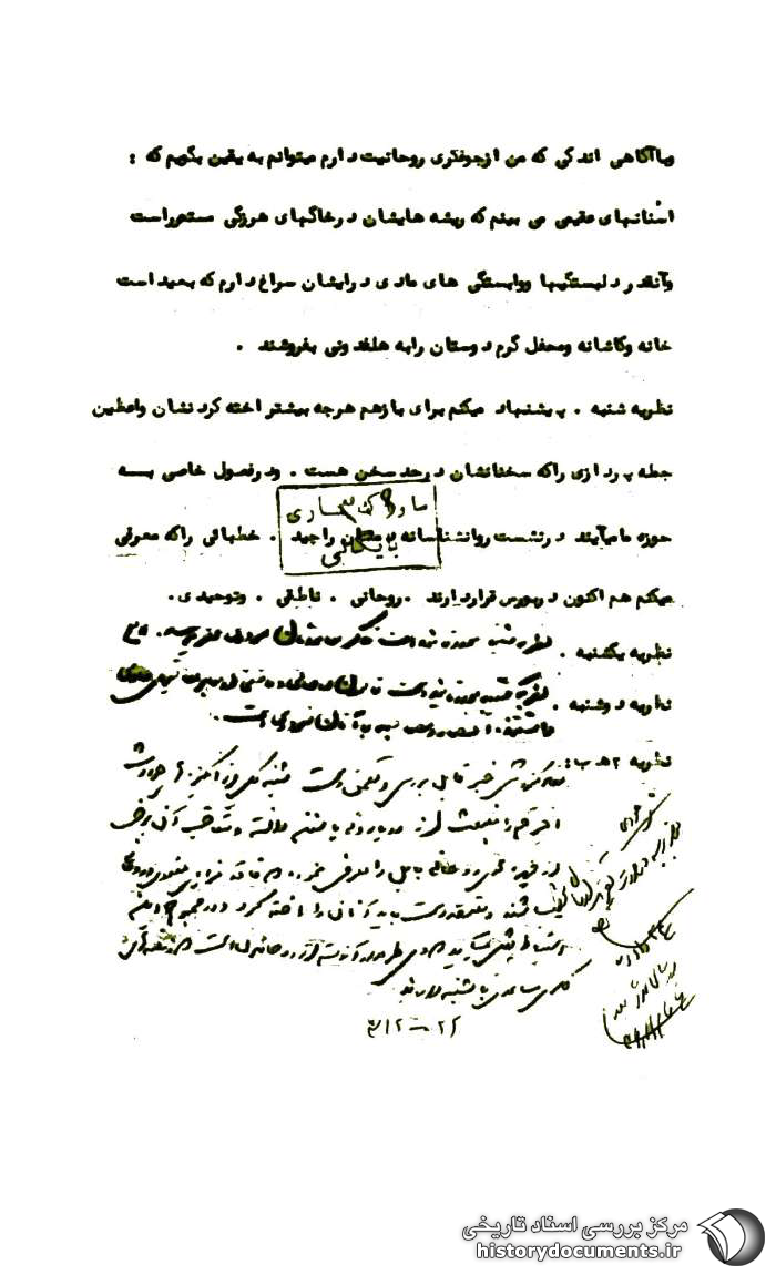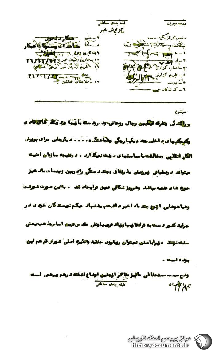 پراکندگی و تفرقه فیمابین رجال روحانی و دار و دستهبازیها و زد و بندهای مادی و کشمکشهای داخلی و عدم یکپارچگی و هماهنگی و... دیگر جایی برای پرورش افکار انقلابی و مخالفت با سیاستهای دولت نمیگذارد. در نتیجه سازمان امنیت میتواند در عملیاتی زیرزمینی بذر نفاق و چنددستگی را در بین زمینهای بادخیز حوزههای علمیّه بپاشد و هر روز شکافی عمیقتر ایجاد کند. با این صورت شورشها و هیاهوهایی از نوع چند ماه اخیر داشت پیشنهاد میکنم نویسندگان خودی در جراید کشور دست به [ناخوانا] و زیادهرویها و نفی مقدّسترین اساس مذهب یعنی سنت نزنند، زیرا با سنن نمیتوان رویاروی جنگید و انگیزه اصلی شورش قم همین بوده است.