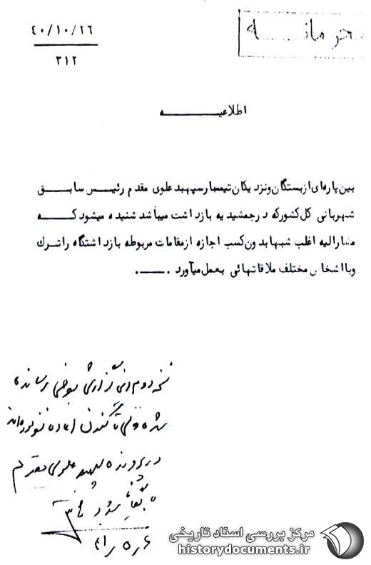 نسخه دوم این گزارش به عرض رسانده شده ولی تاکنون اعاده نفرمودهاند در پرونده سپهبد علویمقدم بایگانی شود. ثابتی 6 /5 /41