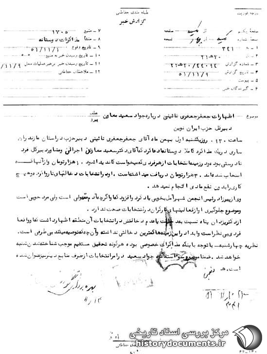 ساعت 0930 روز یکشنبه اول بهمن ماه آقای جعفر جعفری نائینی دبیر حزب در استان مازندران ساری در یک مذاکره کاملاً دوستانه ادعا کرد که آقای دکتر سعید معاون اجرایی و مشاور دبیرکل فرد نادرستی بوده و در زمینه انتخابات از هر فردی که میخواست کاندیدا شود 10 هزار تومان و از آنها که انتخاب شدهاند 30 هزار تومان دریافت میداشته است. او در انتخابات دخالتهای ناروا کرده و هیچ کاری را بدون نفع مادی انجام نمی دهد.