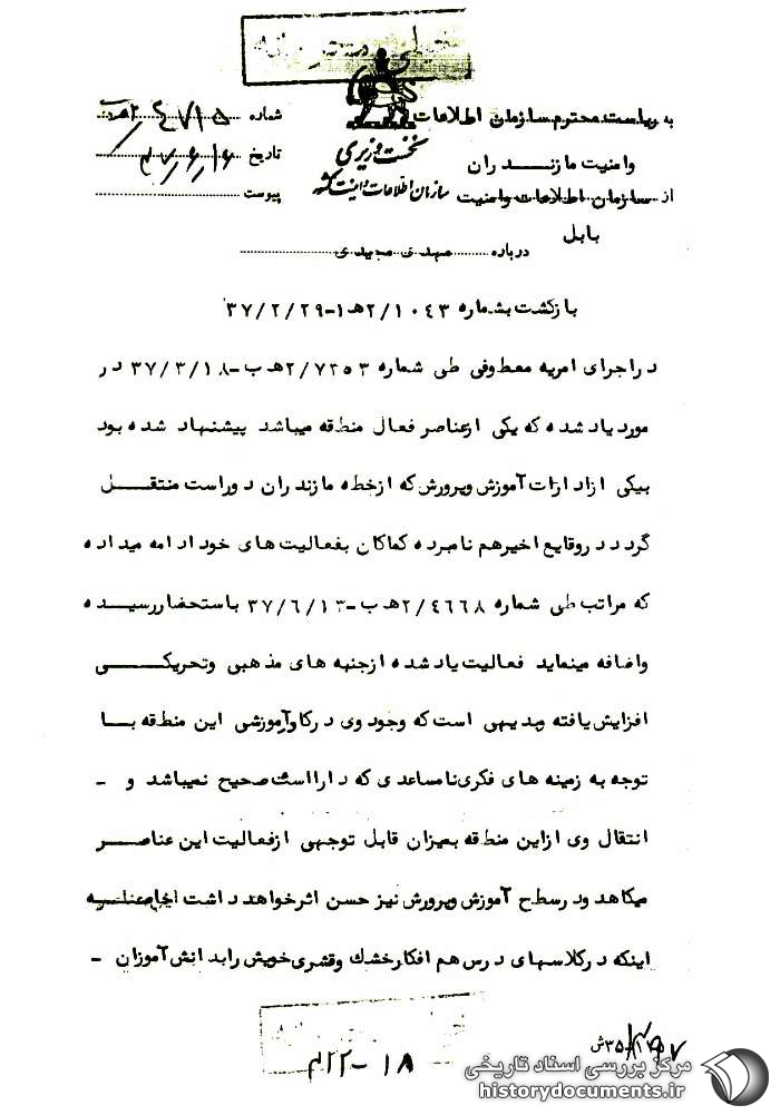 در اجرای امریّه معطوفی طیّ شماره 7353 /2ﻫ ب – 18 / 3 /37 در مورد یادشده که یکی از عناصر فعال منطقه میباشد. پیشنهاد شده بود به یکی از ادارات آموزش و پرورش که از خطه مازندران دور است منتقل گردد در وقایع اخیر هم نامبرده کماکان به فعالیتهای خود ادامه میداده که مراتب طیّ شماره 4668 / 2 ﻫ ب – 13 /6 / 37 به استحضار رسیده و اضافه مینماید فعالیت یادشده از جنبههای مذهبی و تحریکی افزایش یافته و بدیهی است که وجود وی در کادر آموزشی این منطقه با توجه به زمینههای فکری نامساعدی که داراست صحیح نمیباشد و انتقال وی از این منطقه به میزان قابل توجهی از فعالیت این عناصر میکاهد و در سطح آموزش و پرورش نیز حسن اثر خواهد داشت. خاصه این که در کلاسهای درس هم افکار خشک و قشری خویش را به دانشآموزان تزریق نخواهد کرد مقرر فرمائید قبل از شروع سال تحصیلی نسبت به انتقال یادشده اوامر لازم صادر و نتیجه را به این سازمان اعلام دارند.
