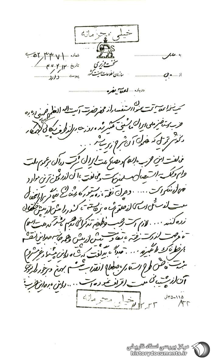 یک نسخه اعلامیه تحت عنوان استفسار از محضر حضرت آیتالله العظمی خمینی درباره حزب رستاخیز ملّی ایران ماشینی تکثیر شده روز جاری از طرف پیکانی محصّل به همکار دلخوش تحویل که مضمون آن به شرح زیر میباشد .....