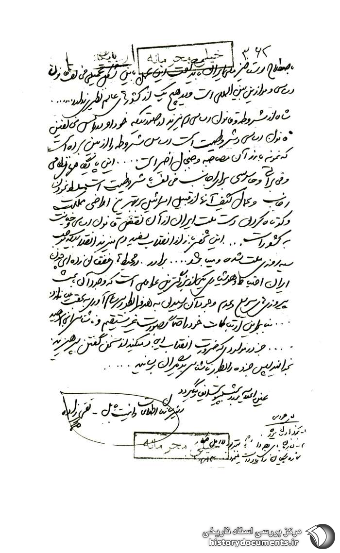 شاه از مشروطه و قانون اساسی دم میزند در صورتی که خود او در رأس مخالفین قانون اساسی و مشروطیت است. اساس مشروطه را از بین برده است که نمونهی بارز آن مصاحبه و جنجال اخیر است... این پایگاههای نظامی و مخابراتی و جاسوسی برای اجانب مخالف با مشروطیت است. مسلّط نمودن اجانب و عمّال کثیف آنها از قبیل اسرائیل بر بهترین اراضی مملکت و کوتاه کردن دست ملّت ایران از آن نقض قانون اساسی و خیانت به کشور است ..... این شخص باز از انقلابسفید دم میزند انقلابی که موجب سیه روزی ملّت شده و میباشد ... برادر. در محیطهای