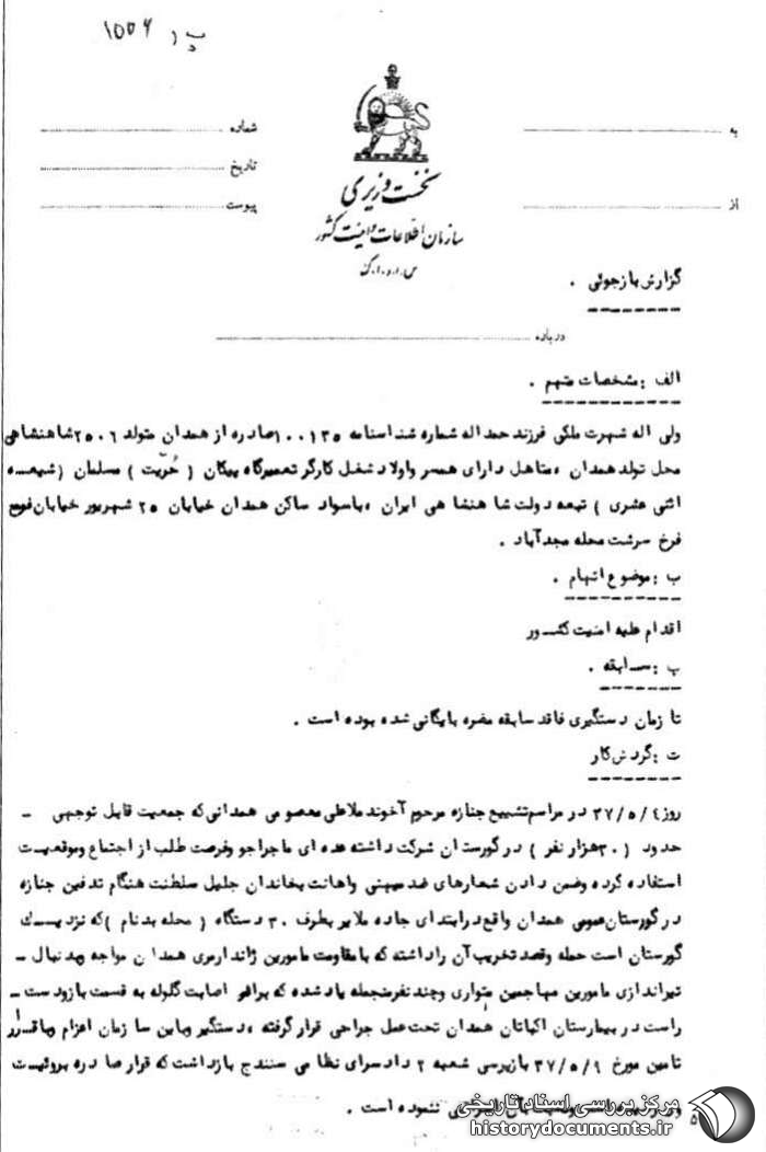 روز 4 /5 /37 در مراسم تشییع جنازه مرحوم آخوند ملاعلی معصومی همدانی که جمعیت قابل توجهی (حدود ۳۰ هزار نفر) در گورستان شرکت داشتند عدهای ماجراجو و فرصت طلب از اجتماع و موقعیت استفاده کرده و ضمن دادن شعارهای ضدمیهنی و اهانت به خاندان جلیل سلطنت هنگام تدفین جنازه در گورستان عمومی همدان واقع در ابتدای جاده ملایر به طرف ۳۰ دستگاه (محله بدنام) که نزدیک گورستان است حمله و قصد تخریب آن را داشتند که با مقاومت مأمورین ژاندارمری همدان مواجه و به دنبال تیراندازی مهاجمین متواری- و چند نفر منجمله یاد شده دستگیر و به این سازمان اعزام و با قرار تأمین مورخ 9 /5 /37 بازپرستی شعبه ۲- دادسرای نظامی سنندج بازداشت که قرار صادره به رویت وی رسیده نسبت به آن اعتراضی ننموده است.