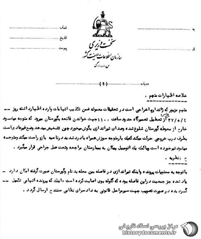متهم مزبور که ژاندارم اخراجی است در تحقیقات معموله ضمن تکذیب اتهامات وارده اظهار داشته روز 4 /5 /37 پس از تعطیلی تعمیرگاه حدود ساعت ۱۱ جهت خواندن فاتحه به گورستان میرود که متوجه میشود خارج از محوطه گورستان شلوغ شده و صدای تیراندازی به گوش میخورد چون تشخیص میدهد که وضع غیر عادی به طرف درب خروجی حرکت میکند که یک بار متوجه سوزش همراه با درد شدید در ناحیه بازو راست میکند و متوجه میشود تیر خورده است و با کمک یک اتومبیل پیکان به بیمارستان مراجعه و تحت عمل جراحی قرار میگیرد.