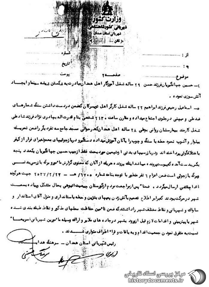 5- اسماعیل رحیمی فرزند ابراهیم ۲۲ ساله شغل کارگر اهل تویسرکان که ضمن در دست داشتن سنگ شعارهای ضد ملی و میهنی در جلوی اجتماع می داده و مقارن ساعت ۱۲:۳۰ شخصی به نام قدرتالله بهادرینژاد فرزند شاد علی شغل کارمند بیمارستان روانی بوعلی ۲۸ ساله اهل همدان که در حوالی مسجد جامع سه نفر دیگر را ضمن تحریک بلوا و آشوب نحوه حمله با سنگ و چوب را به آنان آموزش میداده دستگیر و در بازجوییهای معموله برای فرار از کیفر به اختلاف گویی پرداختهاند و در بازرسیهای بدنی از متهمین مورد بحث فقط از جیب حسین جهانگیریان یک عدد پنجه بکس بدست آمده که پیوست پرونده میباشد اینک پرونده هریک از آنان که محتوی گزارش مأمور و برگ بازرسی بدنی و برگ بازجویی است ضمن اعزام 6 نفر منظور با توجه به نامه شماره 675 ه- 27 /2 /2537 جهت هرگونه اقدام مقتضی ارسال میگردد، ضمناً پس از مراجعت مردم از گورستان جمعیت انبوهی بحال متشکل و پیاده به سمت شهر در حرکت بودند که برابر اطلاع تصمیم به آتشزدن پمپهای بنزین و حمله به استانداری و منزل آقای استاندارد و ساواک و شهربانی و نقاط مختلف شهر را داشتند که ضمن تأمین حفاظت محل های مذکور و نقاط طبقه بندی شده شهر با پیشبینی اقدامات لازم قبل از ورود به شهر در جادههای ملایر و اراک به وسیله مأمورین شهربانی سریعاً نسبت به متفرق نمودن جمعیت و اقدام و به باغات و قراء اطراف متواری شدند.