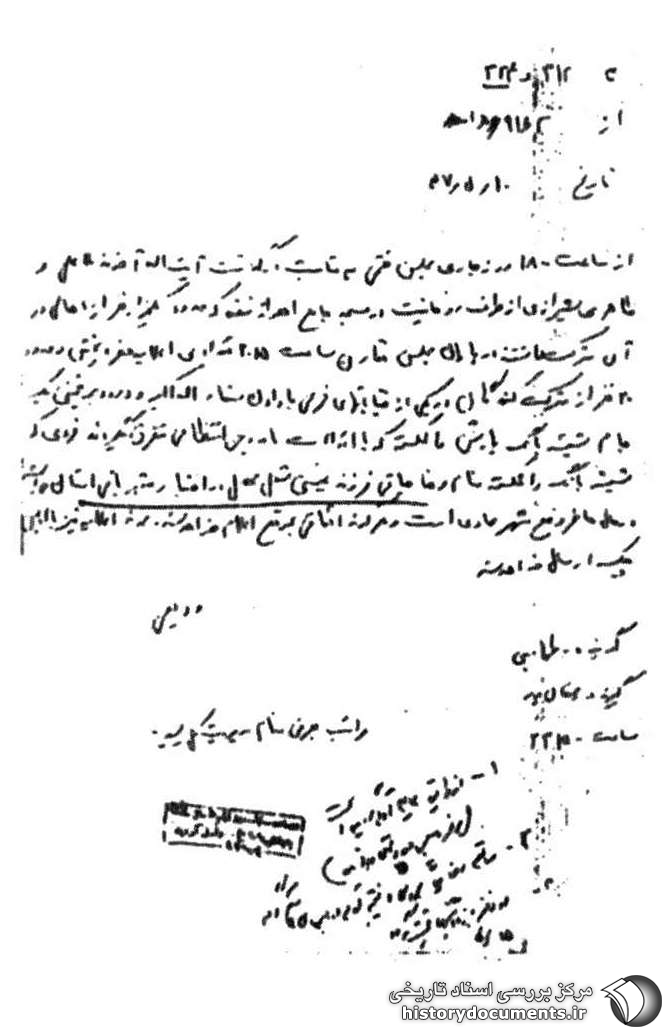 از ساعت ۱۸۰۰ روز جاری مجلس ختمی به مناسبت درگذشت آیتاله آخوند ملاعلى و طاهری شیرازی از طرف روحانیت در مسجد جامع اهواز منعقد که حدود یک هزار نفر از اهالی در آن شرکت داشتند در پایان مجلس مقارن ساعت ۲۰۱۵ تعدادی اعلامیه مضره پخش و حدود ۲۰ نفر از شرکت کنندگان در یکی از خیابانهای فرعی با دادن شعار الله اکبر و درود بر خمینی یک جام شیشه بانک پارس را شکسته که با اقدامات مأمورین انتظامی متفرق میگردند فردی که شیشه بانک را شکسته بنام رضا حیاتی فرزند عیسی شغل محصل در اختیار شهربانی استان میباشد در حال حاضر وضع شهر عادی است و هر گونه اتفاقی به موقع اعلام خواهد شد. نمونه اعلامیه نیز با اولین پیک ارسال خواهد شد.