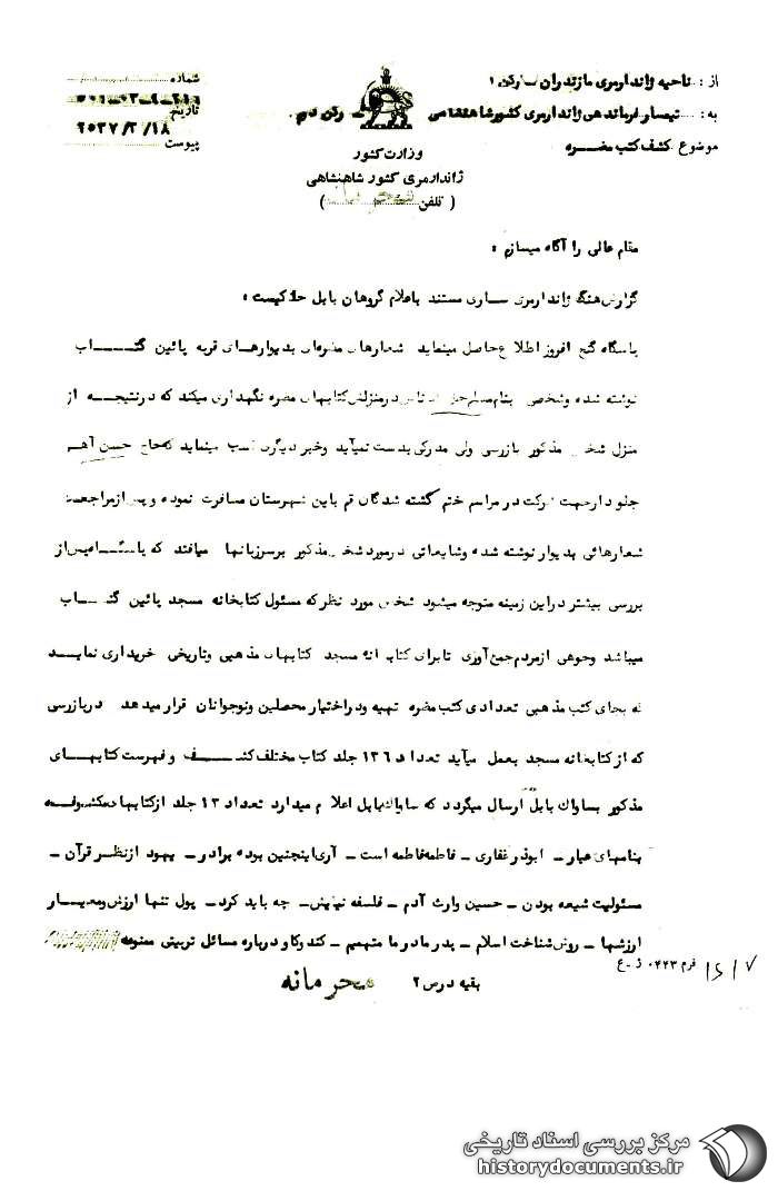 پاسگاه گنج افروز اطلاع حاصل مینماید شعارهای مضرّهای به دیوارهای قریه پائین گتاب نوشته شده و شخصی به نام مسلم حقشناس در منزلش کتابهای مضرّه نگهداری میکند که در نتیجه از منزل شخص مذکور بازرسی ولی مدرکی به دست نمیآید و خبر دیگری کسب مینماید که حاج حسن آهی جلودار1 جهت شرکت در مراسم ختم کشتهشدگان قم به این شهرستان مسافرت نموده و پس از مراجعت شعارهائی به دیوار نوشته شده و شایعاتی در مورد شخص مذکور بر سر زبانها میافتد که پاسگاه پس از بررسی بیشتر در این زمینه متوجه میشود شخص مورد نظر که مسئول کتابخانه مسجد پائین گتاب میباشد وجوهی از مردم جمعآوری تا برای کتابخانهی مسجد کتابهای مذهبی و تاریخی خریداری نماید که به جای کتب مذهبی تعدادی کتب مضرّه تهیه و در اختیار محصّلین و نوجوانان قرار میدهد. در بازرسی که از کتابخانه مسجد به عمل میآید تعداد 136 جلد کتاب مختلف کشف و فهرست کتابهای مذکور به ساواک بابل ارسال میگردد که ساواک بابل اعلام میدارد تعداد 13 جلد از کتابهای مکشوفه به نامهای: عیار [عمّار]، ابوذر غفاری، فاطمه فاطمه است، آری این چنین بود برادر، یهود از نظر قرآن، مسئولیت شیعه بودن، حسین وارث آدم، فلسفه نیایش، چه باید کرد، پول تنها ارزش و معیار ارزشها، روش شناخت اسلام، پدر و مادر ما متهمیم، کند و کاو درباره مسائل تربیتی ممنوعه میباشد در تحقیقاتی که از نامبرده به عمل آمده اظهار نموده کتب مذکور را از کتابفروشیهای بابل خریداری و تعدادی هم وسیله اهالی به کتابخانه اهدا گردیده و نمیداند کتابهای ممنوعه را از کدام کتابفروشی خریداری کرده است و در مورد رفتن به قم نیز اظهار داشت در تاریخ 28 /2 /37 که به تهران رفته بودم جهت زیارت به قم رفته و شب جمعه در قم بوده و عصر جمعه مراجعت نموده و کسی را در قم ندارد و نمیشناسد و هیچ نوع فعالیت مضرّهای ندارد که با گروهان بابل اظهارنظر نموده، حاج حسن آهی به تحریک دیگران کتب ممنوعه را در پوشش کتابهای مذهبی به کتابخانه مسجد آورده و جهت مطالعه در اختیار نوجوانان و محصّلین گذارده است و به نظر میرسد در نوشتن شعارهای مضرّه نیز دخالت داشته است. نامبرده با تشکیل پرونده به همراه کتب مکشوفه به دادسرای بابل اعزام و معرفی، ذیل همین شماره ضمن اعلام مراتب به ساواک استان، سرآنجام کار نامبرده در دادسرا از هنگ ژاندارمری ساری خواستار به محض حصول پاسخ مراتب به عرض خواهد رسید. ر