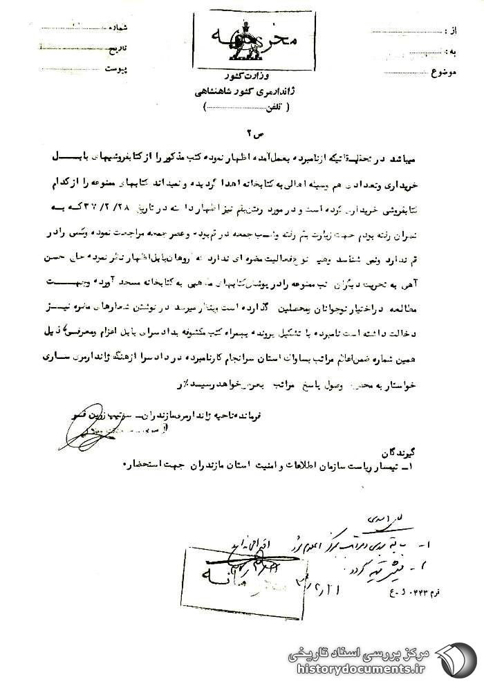 1- تیمسار ریاست سازمان اطلاعات و امنیت استان مازندران جهت استحضار.