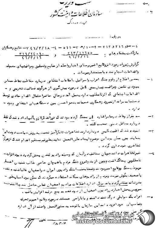 گزارش زیر در مورد اثر وقایع اخیر، برمبناى اخبار واصله از منابع و تحقیق و مراقبتهای معموله و اقدامات انجام شده به استحضار مىرساند: