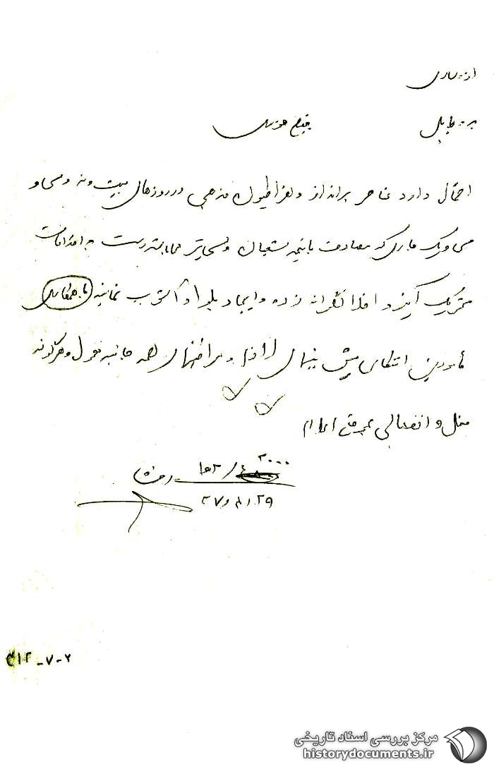 احتمال دارد عناصر برانداز و افراطیون مذهبی در روزهای بیست و نه، سی و سی و یک جاری که مصادف با نیمه شعبان و سی تیر1 میباشد. دست به اقدامات تحریکآمیز و اخلالگرانه زده و ایجاد بلوا و آشوب نمایند. با همکاری مأمورین انتظامی پیشبینیهای لازم و مراقبتهای همهجانبه معمول و هرگونه فعل و انفعالاتی به موقع اعلام [شود].
