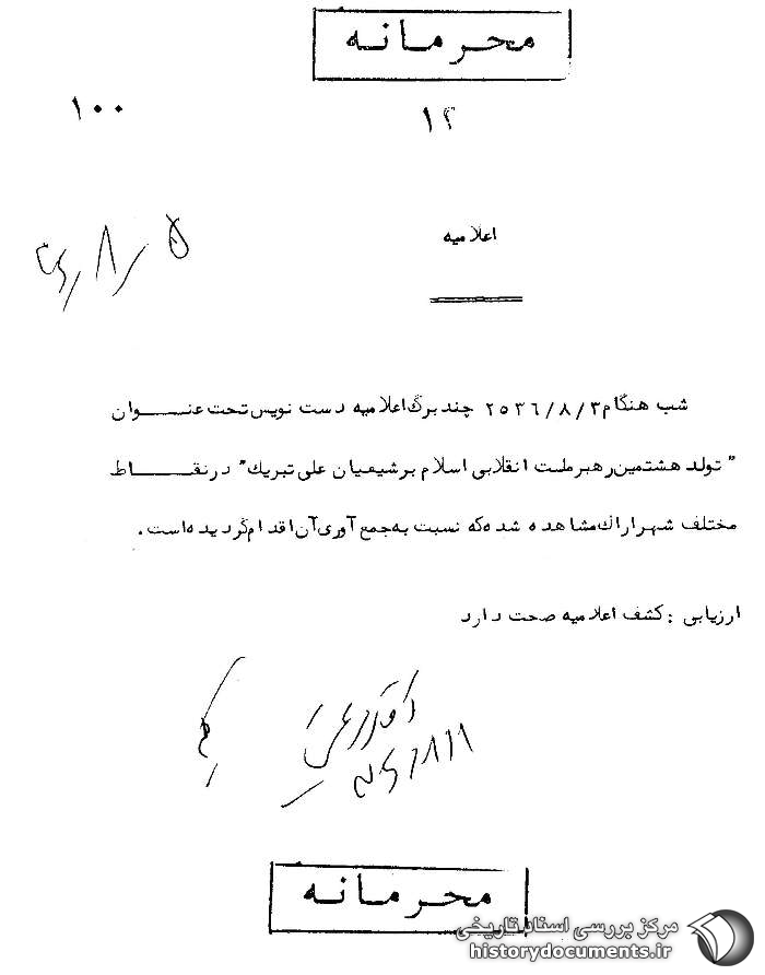 شب هنگام 3 /8 /2536 چند برگ اعلامیه دست نویس تحت عنوان" تولد هشتمین رهبر ملت انقلابی اسلام بر شیعیان علی تبریک"در نقاط مختلف شهر اراک مشاهده شده که نسبت به جمعآوری آن اقدام گردیده است.