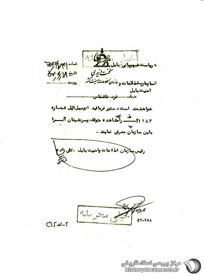 خواهشمند است دستور فرمائید اتومبیل اپل شماره 21283 / ط-پ را به محض مشاهده متوقف و سرنشینان آن را به این سازمان معرفی نمایند.