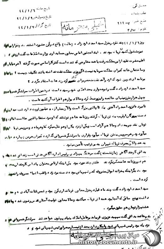 سید احمد داودزاده گفت: چند ماه قبل، در منزل معاون فرماندارى کرج بودم، شمس قناتآبادى هم حضور داشت و پنج ساعتى که آنجا بودم، همهاش تریاک مىکشید و حالا معاون تولیت آستان قدس رضوى شده و ماهانه هشت هزارتومان هم حقوق مىگیرد. در خاتمه بداغى گفت: سپهبد عزیزى قریباً مدیرعامل املاک بنیاد پهلوى خواهد شد. سرلشگر خسروانى هم نزدیک بود رئیس شهربانى شود و امکان دارد بعد از تیمسار مبصر او رئیس شهربانى شود. گیرندگان : اداره کل سوم (314) 2 نسخه