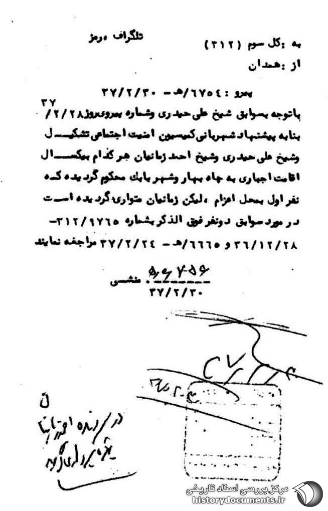 با توجه به سوابق شیخ علی حیدری1 و شماره پیروی روز 28 /2 /37 بنا به پیشنهاد شهربانی کمیسیون امنیت اجتماعی تشکیل و شیخ علی حیدری و شیخ احمد زمانیان هر کدام به یکسال اقامت اجباری به چاه بهار و شهر بابک محکوم گردیده که نفر اول به محل اعزام، لیکن زمانیان2 متواری گردیده است در مورد سوابق دو نفر فوق الذکر به شماره 9765 /312 – 28 /12 /36 و 6665/ ه- 24 /2 /37 مراجعه نمایند.