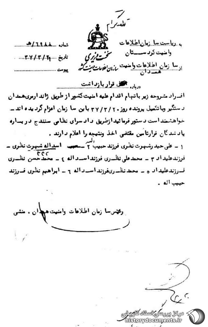افراد مشروحه زیر به اتهام اقدام علیه امنیت کشور از طریق ژاندارمری همدان دستگیر و با تکمیل پرونده روز 20 /3 /37 به این سازمان اعزام گردیدهاند. خواهشمند است دستور فرمائید از طریق دادسرای نظامی سنندج درباره یادشدگان قرار تأمین مقتضی اخذ و نتیجه را اعلام دارند.