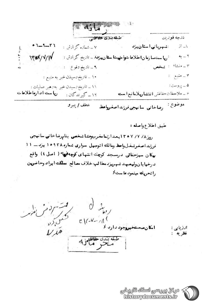روز 8 /7 /1357 بعد از نماز مغرب و عشاء شخصی به نام رضا خانی سانیجی1 فرزند اصغر شغل واعظ و مالک اتومبیل سواری شماره 15938 یزد- 11 پیکان سبز حنائی در مسجد کوچک انتهای کوچه ضیاء (اصل 4) واقع در خیابان ولیعهد شهر یزد مطالب خلاف مصالح مملکت ایراد و حاضرین را تحریک مینموده است.
