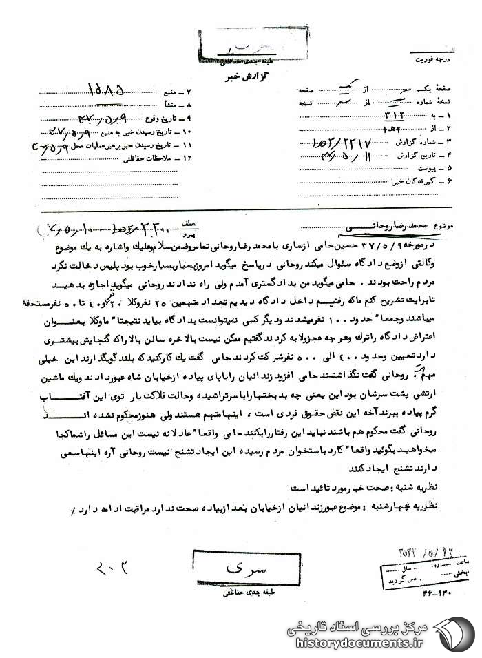 در مورخه 9 /5 /37 حسن حامی1 از ساری با محمدرضا تماس و ضمن سلام و علیک و اشاره به یک موضوع وکالتی از وضع دادگاه سئوال میکند روحانی در پاسخ میگوید امروز بسیار بسیار خوب بود پلیس دخالت نکرد مردم راحت بودند. حامی میگوید من به دادگستری آمدم ولی راه ندادند روحانی میگوید اجازه بدهید تا برایت تشریح کنم ما که رفتیم داخل دادگاه دیدیم تعداد متهمین 25 نفر وکلا 20 نفر و 40 تا 50 نفر مستحفظ میباشند و جمعاً حدود 100 نفر میشدند و دیگر کسی نمیتوانست به دادگاه بیاید نتیجتاً ما وکلا به عنوان اعتراض دادگاه را ترک و هرچه عجز و لابه کردند گفتیم ممکن نیست بالاخره سالن بالا را که گنجایش بیشتری دارد تعیین و حدود 400 الی 500 نفر شرکت کردند حامی گفت یککار کنید که بلندگو بگذارند این خیلی مهم است. روحانی گفت نگذاشتند حامی افزود زندانیان را با پای پیاده از خیابان شاه عبور دادند و یک ماشین ارتشی پشت سرشان بود این یعنیچه بدبختها را با سر تراشیده و حالت فلاکتبار توی این آفتاب گرم پیاده ببرند آخه این نقض حقوق فردی است، اینها متهم هستند ولی هنوز محکوم نشدهاند روحانی گفت محکوم هم باشند نباید این رفتار را بکنند حامی واقعاً عادلانه نیست این مسائل را شما کجا میخواهید بگویید واقعاً کارد به استخوان مردم رسیده این ایجاد تشنج نیست [؟] روحانی آره اینها سعی دارند تشنج ایجاد کنند.