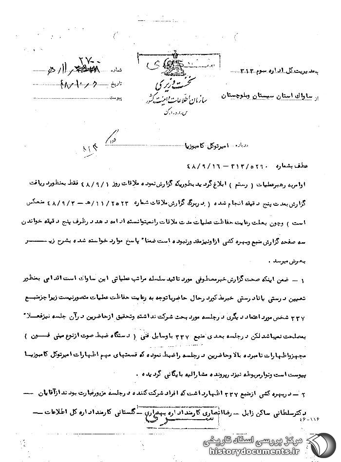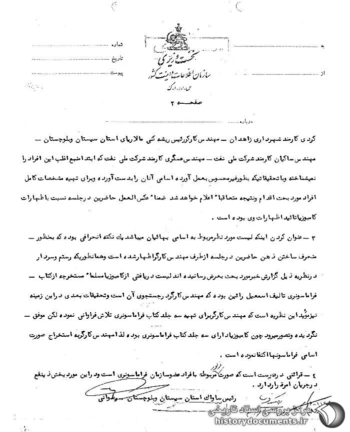 از : ساواک استان سیستان و بلوچستان شماره : 2700 /11/ ه