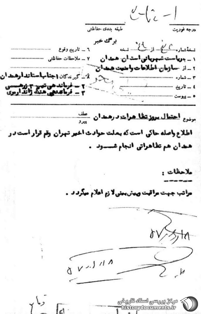 اصلاع واصله حاکی است که به علت حوادث اخیر تهران و قم قرار است در همدان هم تظاهراتی انجام شود.