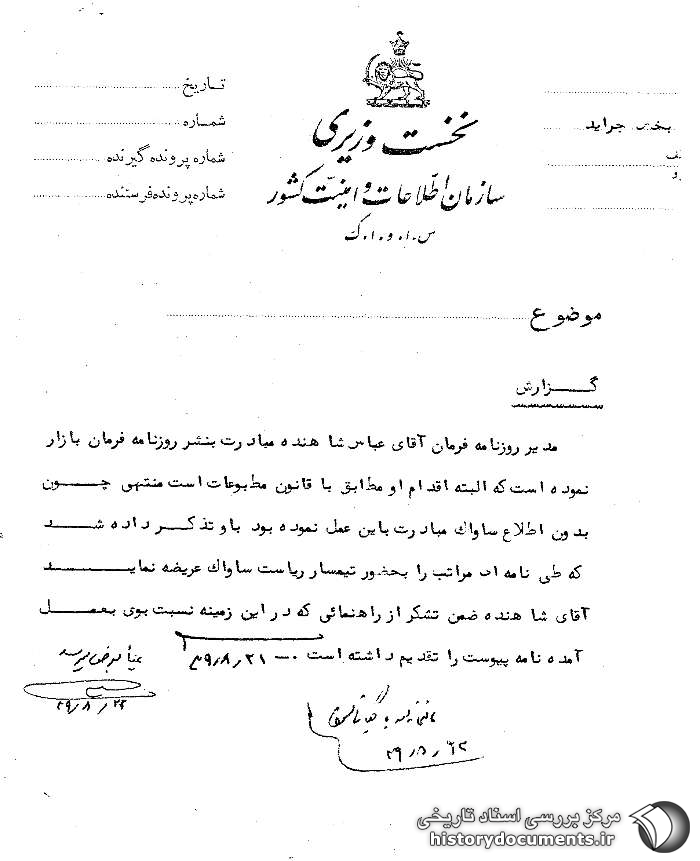 نامه ای مراتب را به حضور تیمسار ریاست ساواک عریضه نماید1 آقای شاهنده