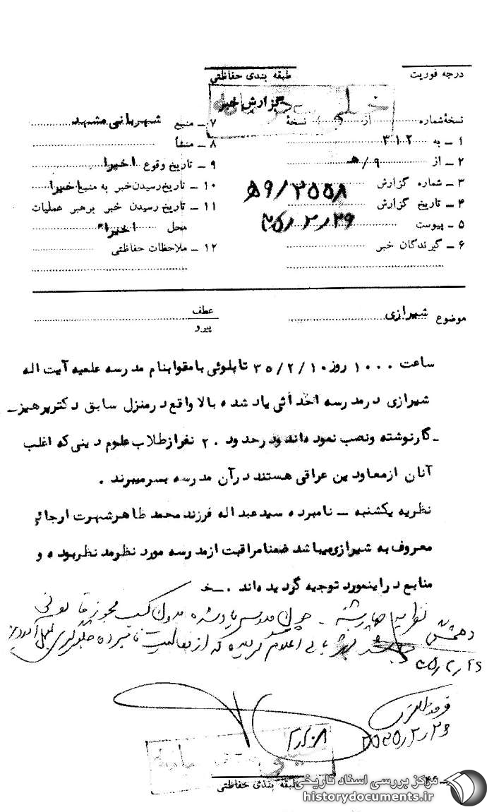 ساعت 1000 روز 10 /2 /35 تابلوئی با مقوا به نام مدرسه علمیه آیتاله شیرازی در مدرسه احداثی یادشده بالا واقع در منزل سابق دکتر پرهیزگار نوشته و نصب نمودهاند و در حدود 20 نفر از طلاب علوم دینی که اغلب آنان از معاودین عراقی هستند در آن مدرسه به سر میبرند.